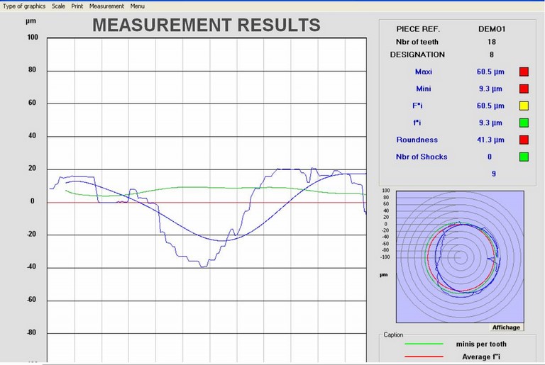 - Incremental gauge connected to a computer. The measured values are computed to calculate the normalized values (F"i, f"i, Fr). The software will also determine automatically, if the measured gear is "in conformity" or not, based on some criteria pre defined by the user. (C)